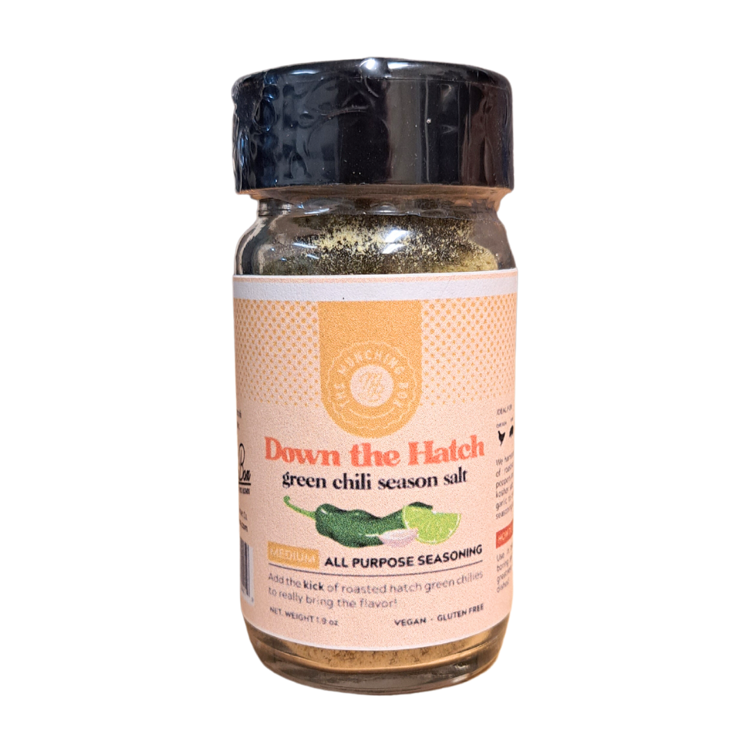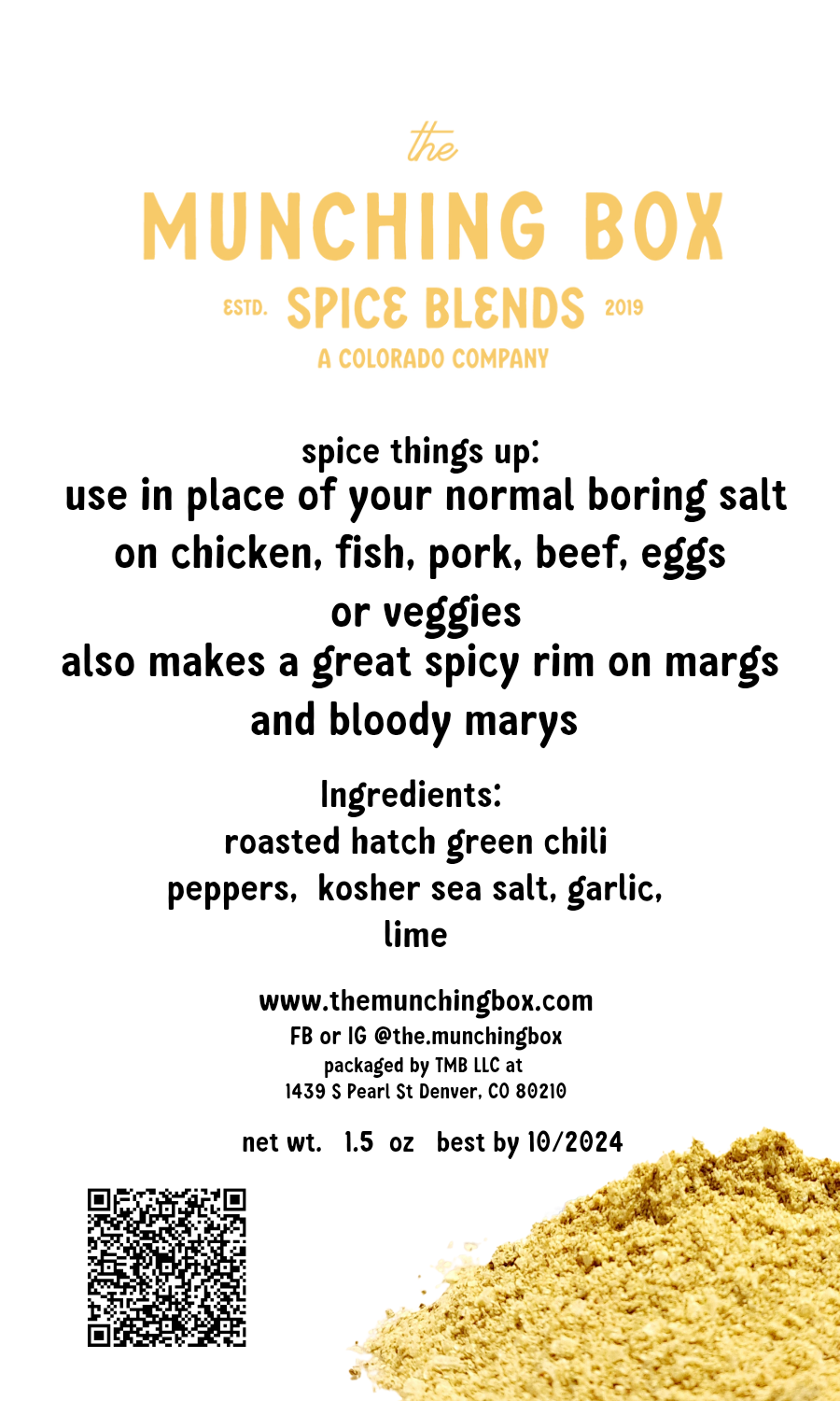 We have harnessed the deep Umami of fire roasted hatch green chili peppers and blended them with kosher salt, lime and a hint of garlic to bring you the perfect seasoning salt.