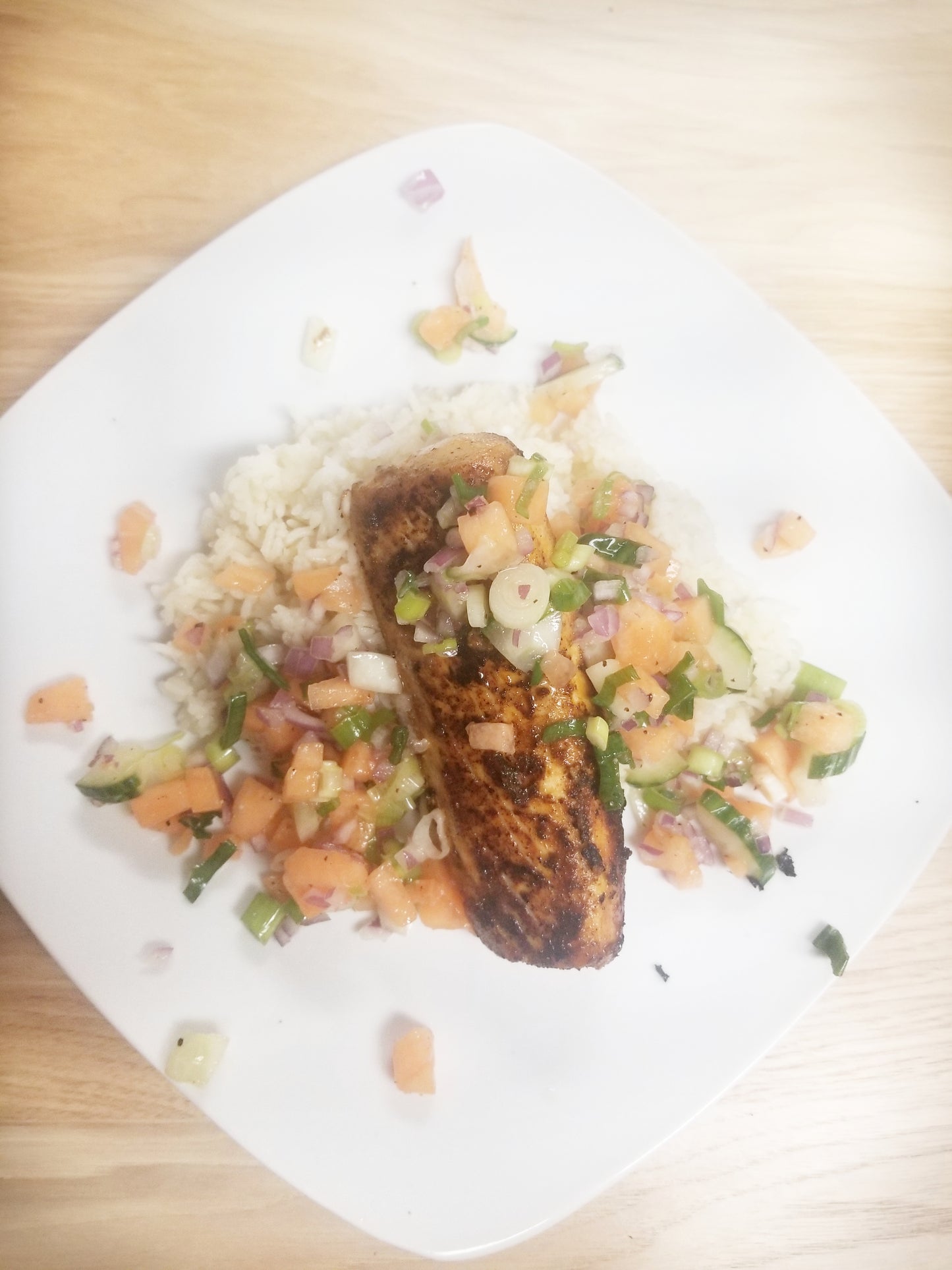 Cut 1 lb of chicken into cubes and marinate in 1 tbsp of Jamaican Me Hungry, juice of 1 lime and 1 tbsp of oil for at least 1 hour. Slide onto some skewers, alternating chicken with pineapple chunks, peices of onion and bell pepper. Then grill on medium heat until the chicken reaches 165°.